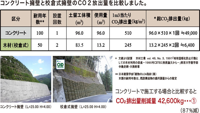 温暖化防止のために土木分野で求められていることは、CO2の発生が少なく、耐久性の高い土木工法です。O&Dウッドの構造物は同じ規模のコンクリートと比べてもCO2の排出量が少なく環境保全に貢献できる優れた工法と言えます。