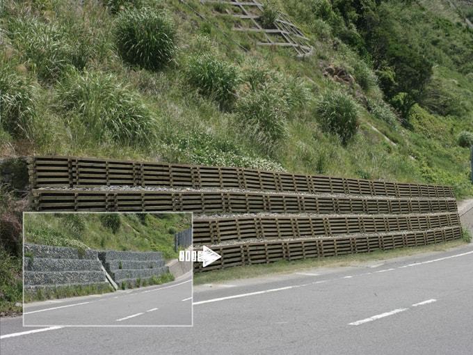 鋼製の枠工と同様で中詰材に石材を使用した場合は、多孔質構造であり透水性に優れています。現場発生土を使用した場合は、残土処理が軽減されて、植生が期待できます。